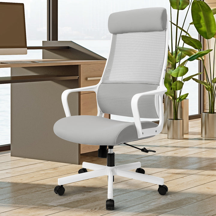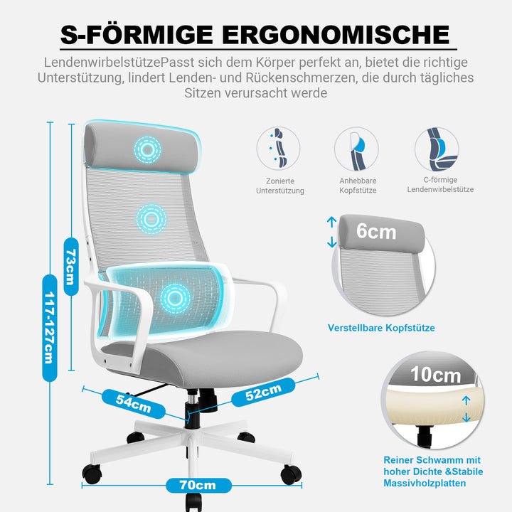 MELOKEA Bürostuhl Ergonomisch, Schreibtischstuhl mit Verstellbarer Kopfstütze, Breites Sitzkissen, Lendenwirbelstütze
