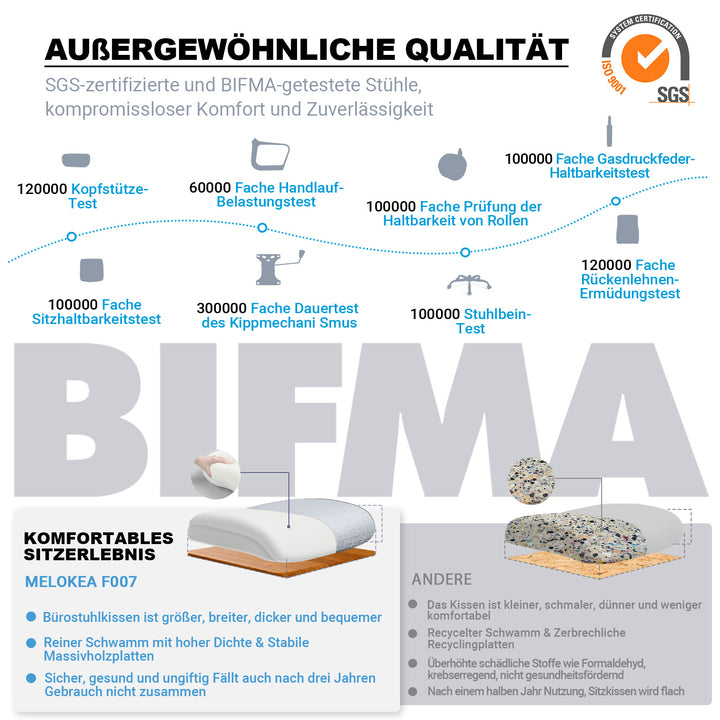 - 【Großer und robuster Schreibtischstuhl】Der F007 Bürostuhl ist mit einem großen Sitzkissen (54 x 52 x 10 cm) ausgestattet, das größer als die Sitzflächen vieler anderer Bürostühle ist. Dadurch erhalten Sie mehr Platz und Komfort. Der Stuhl verfügt über eine robuste Metallbasis, die eine maximale Belastung von 1137 kg trägt und für starke, stabile Unterstützung sorgt. Die Gasdruckfeder ist TÜV-zertifiziert und hat den BIFMA-Test bestanden – sie bietet eine hohe Tragfähigkeit und hervorragende Langlebigkeit für den täglichen Einsatz. Dies garantiert höchste Zuverlässigkeit und Sicherheit.