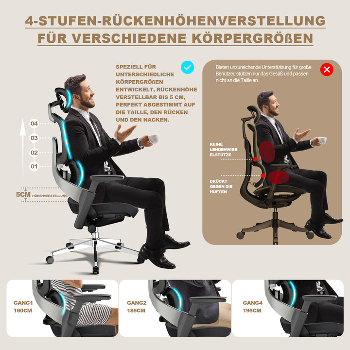 - 【𝐕𝐢𝐞𝐥𝐟ä𝐥𝐭𝐢𝐠𝐞 𝐄𝐢𝐧𝐬𝐭𝐞𝐥𝐥𝐮𝐧𝐠𝐞𝐧】Der Bürostuhl ist mit 4D-Armlehnen, einer 3D-Kopfstütze, einer höhenverstellbaren Rückenlehne von 4 cm und einem Sitzkissen ausgestattet, das um 5 cm vorwärts und rückwärts verstellbar ist. Zusätzlich kann die Sitzhöhe um bis zu 10 cm angepasst werden. Dies ist ein große menschen Bürostuhl, Er ist so konzipiert, dass er Personen unterschiedlicher Körpergrößen von 160 cm bis 195 cm aufnimmt und für jeden optimalen Halt und Komfort gewährleistet.