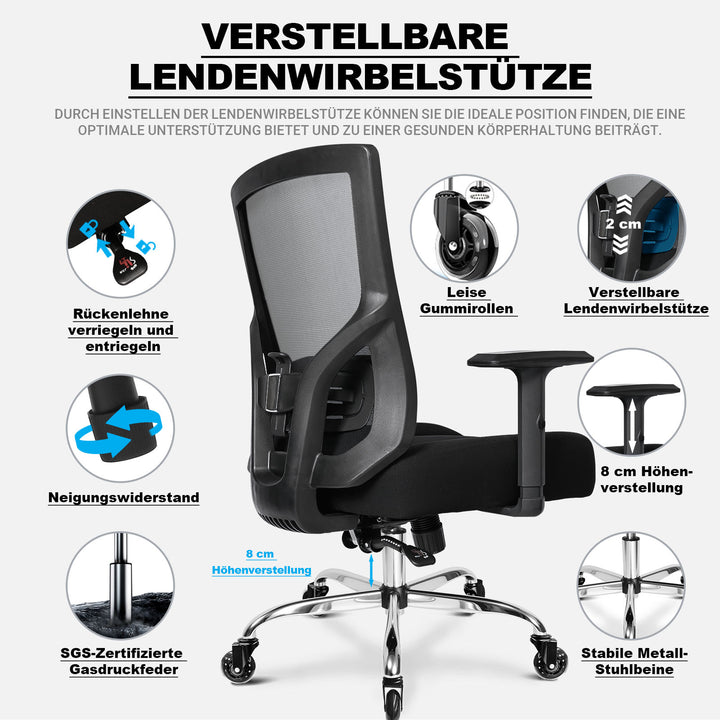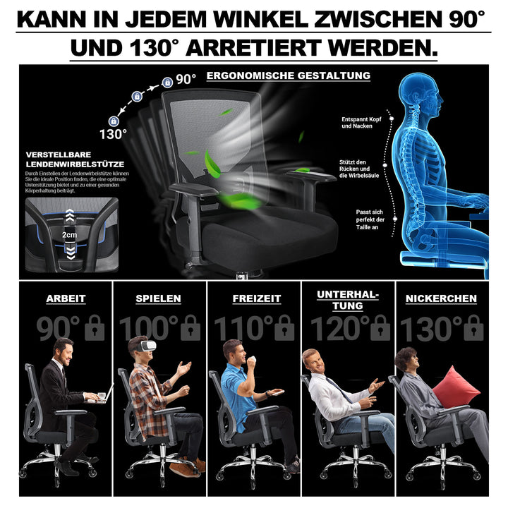 - ✅【Einfach verstellbar für mehr Komfort】Komfort ganz nach Ihren Wünschen – unser Bürostuhl 200kg lässt sich mühelos anpassen: ① Stufenlos neigbar & arretierbar von 90°–130° für entspanntes Zurücklehnen. ② Lendenstütze höhenverstellbar um 2 cm für individuelle Rückenunterstützung. ③ Armlehnen flexibel um 8 cm höhenverstellbar. ④ Sitzhöhe von 46–54 cm einstellbar. So finden Sie garantiert Ihre Lieblingsposition für konzentriertes Arbeiten oder entspannte Pausen.